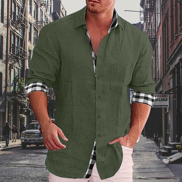 Men S Casual Plaid Patchwork Linen Button Down Shirt Long Sleeve Lapel Regular Fit Holiday Beach Shirt Fall Camp Top Walmart Com